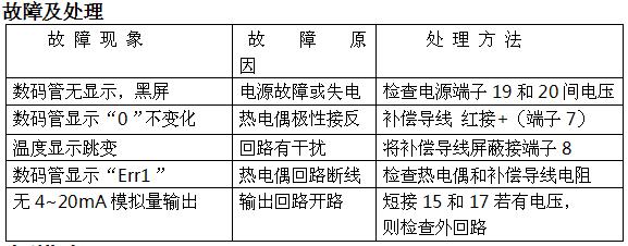 1. 技术参数 电源电压/功耗: AC100-260V/5W 显示: 0-1000℃温度值 输入:特制铠装镍络—镍硅热电偶(K分度、Φ8mm)温度探头 开关量输出:三路,燃烧,熄火,故障(AC220/DC24V、3A) 模拟量输出:一路,4-20mA 或2-10V(PLC输入规格,短接15和17) 温度补偿: 自动 有火/熄火响应: 10~20秒/30~60秒 环境温度:探头 -30~1100℃ 仪表: 0~50℃ 外形/开孔尺寸: 80x160x160 /75X150(横式,竖式) 2. 接线图 4. 参数设定 本装置为智能仪表,具为自学习能力,各项参数经计算后自动整定,不需人工设参。 当燃烧不稳定,误动频繁时,仅需短接出线端子1和2,降低响应速度即可。 5、